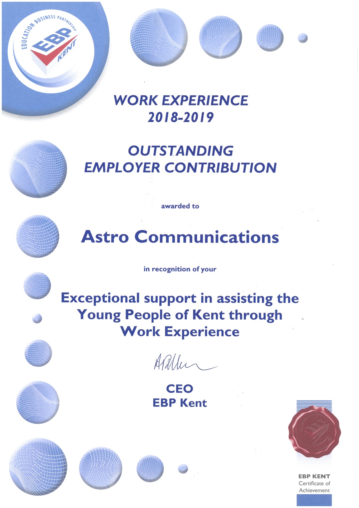 As a result of this we are delighted to announce that we have received Education Business Partnership ‘Outstanding Employer Contribution Award’ in recognition of exception support in assisting the young people of Kent through work experience.