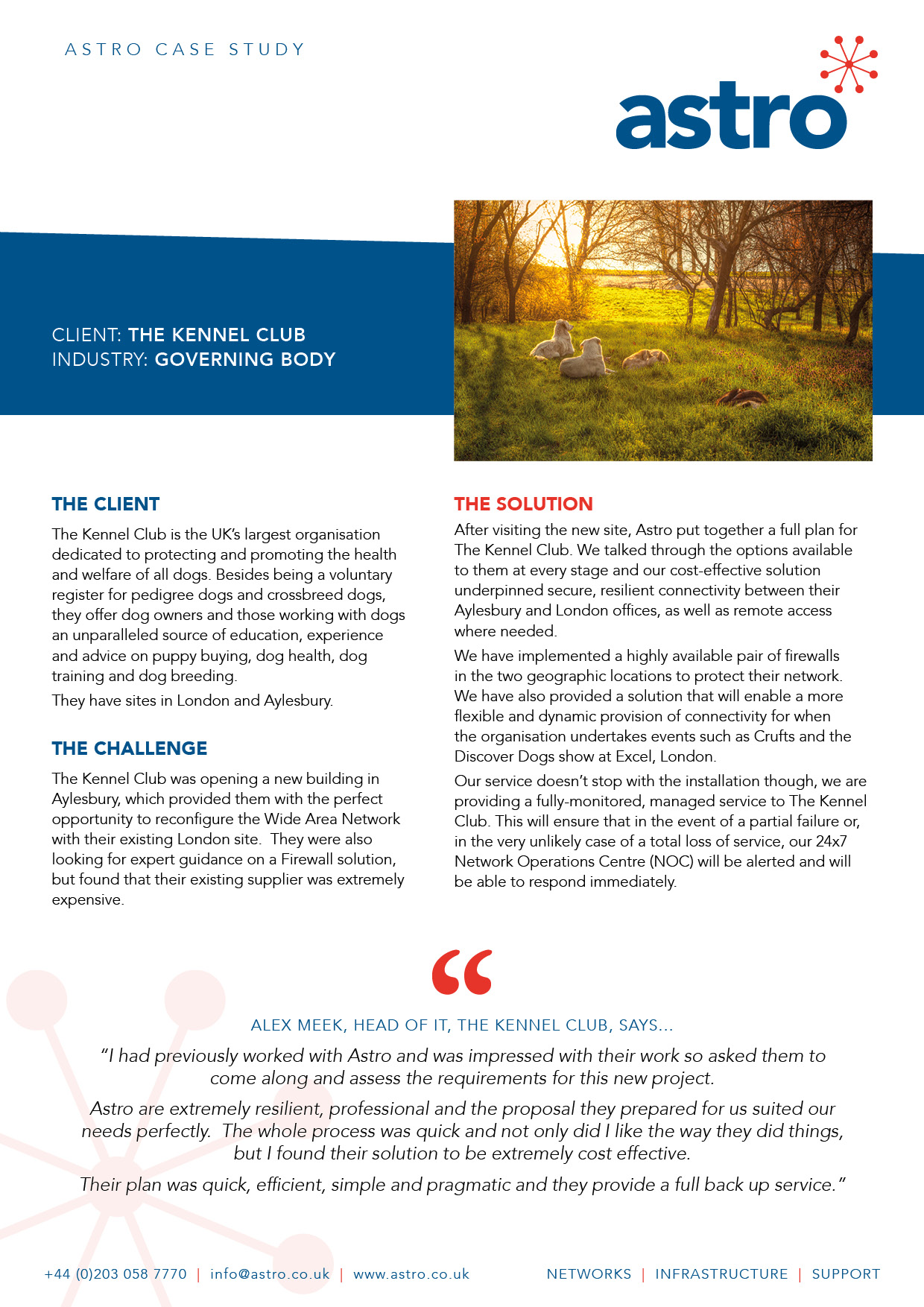 “I had previously worked with Astro and was impressed with their work so asked them to come along and assess the requirements for this new project. Astro are extremely resilient, professional and the proposal they prepared for us suited our needs perfectly. The whole process was quick and not only did I like the way they did things, but I found their solution to be extremely cost effective. Their plan was quick, efficient, simple and pragmatic and they provide a full back up service.”